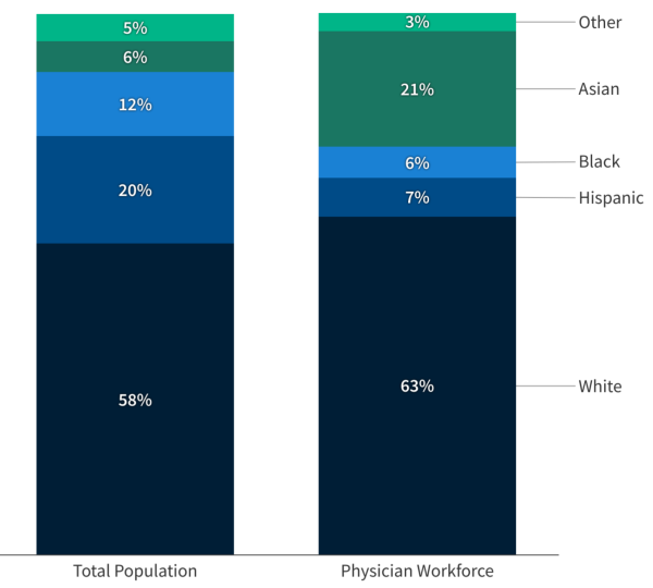 The graph below illustrates the distribution of people by race and ethnicity in the total population and physician workforce, based on KFF’s analysis of 2023 Association of American Medical Colleges Physician Workforce data.